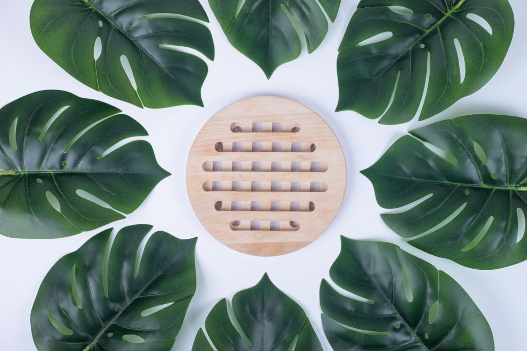 FSC- oder PEFC-Holz schafft Vertrauen und sichert Wälder für kommende Generationen. Ergänzend punkten Bambus, Kork, Hanf und Flachs mit schneller Regeneration. Achte auf Herkunft und Verarbeitung, damit natürlich auch wirklich nachhaltig bedeutet.